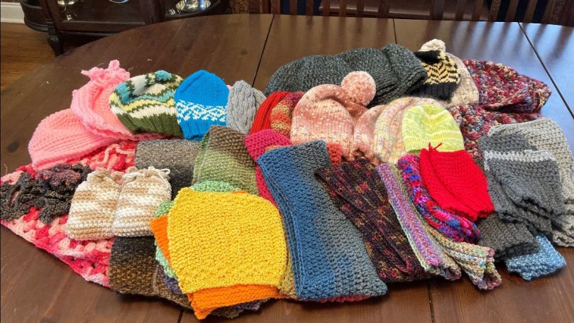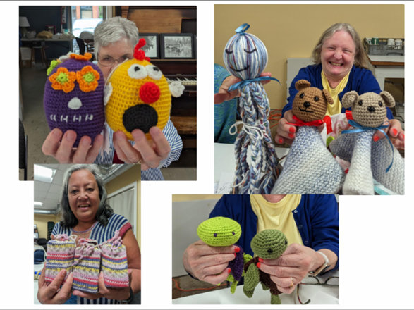 CHARITY KNITTING: Betty Buck, Jean Tressler, Pat Hensley, and Jennifer Cantrell had various charity items to show in May.