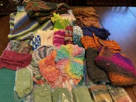 With our weather now, you can pretty much choose your item, be it a hat, cowl, or scarf, fingerless mitts, socks, headbands, or even larger items like sweaters & cardigans are welcome,
